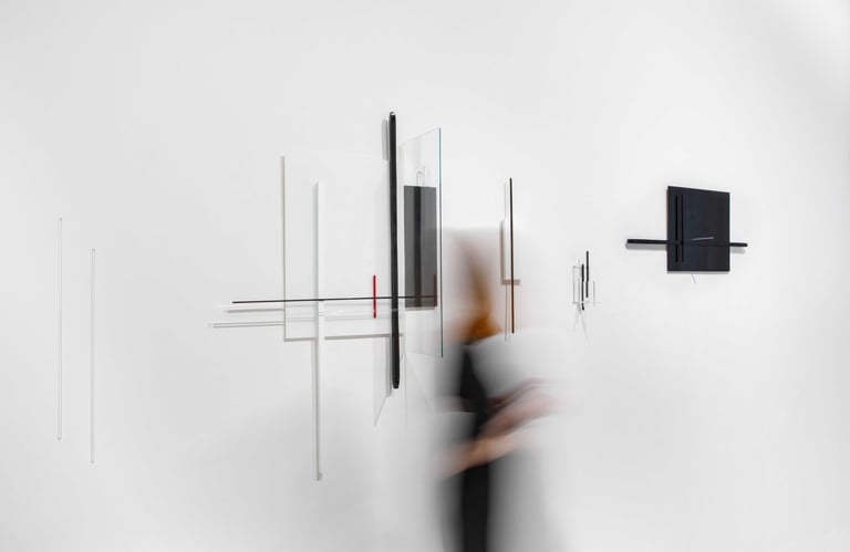 Nástěnné obrazy vycházejí ze základního geometrického uvažování a zásad neboli axiomů. Nejstarší teorie o geometrii a jejím základním využívání najdeme až ve starověkém Egyptě. K vyměřování, místo ustálených jednotek využívali geometři slova. Eukleides definoval tyto výrazy jako základní axiomy podle kterých se mohli matematici řídit. Každý obraz představuje mou interpretaci jednoho z axiomů. Obrazy jsem tvořila pomocí taveného skla, plochého skla a tažených skleněných tyčí. Každý díl obrazu jsem ručně brousila, aby se co nejvěrněji přiblížil podobě hranolu. Vizuálně přesná skladebnost a pravoúhlost kontrastuje s ručně broušeným sklem, které je nepřesné, občas křivé a nepravidelné.